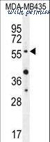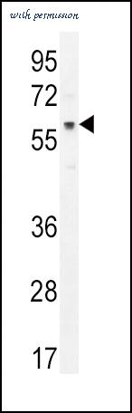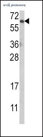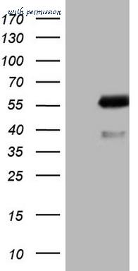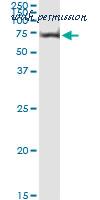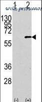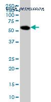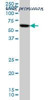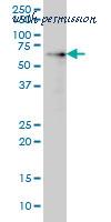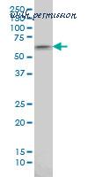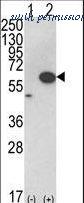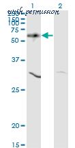 Western blot of AKT1 (arrow) using rabbit polyclonal hAKT1-D453. 293 cell lysates (2 ug/lane) either nontransfected (Lane 1) or transiently transfected with the AKT1 gene (Lane 2) (Origene Technologies).