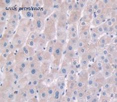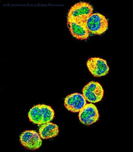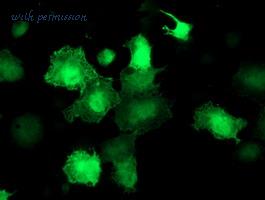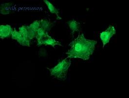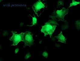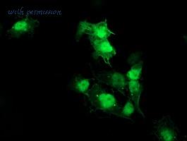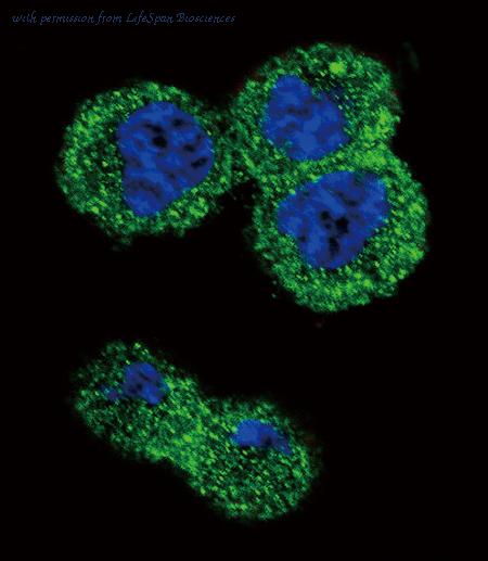 Immunofluorescence of Akt1 in Human Liver cells with Akt1 antibody at 20 ug/ml.