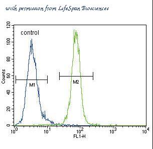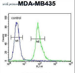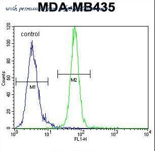 AKT1 Antibody flow cytometry of MDA-MB435 cells (right histogram) compared to a negative control cell (left histogram). FITC-conjugated goat-anti-rabbit secondary antibodies were used for the analysis.