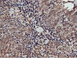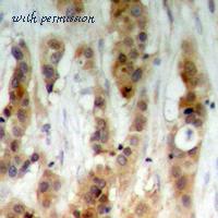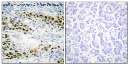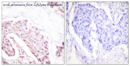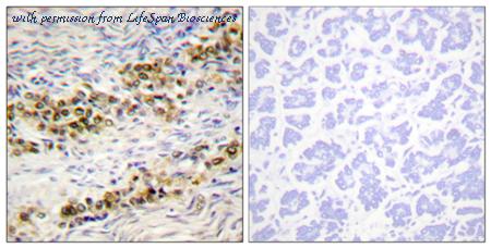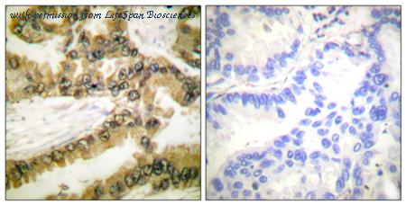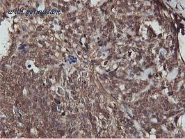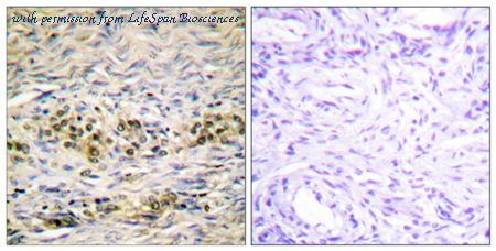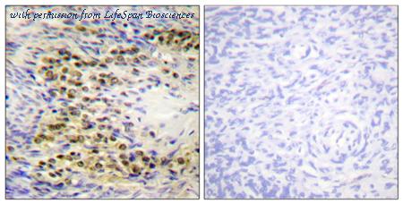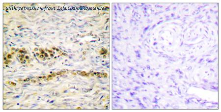 Immunohistochemistry analysis of paraffin-embedded human ovary tissue, using Akt Antibody. The picture on the right is blocked with the synthesized peptide.