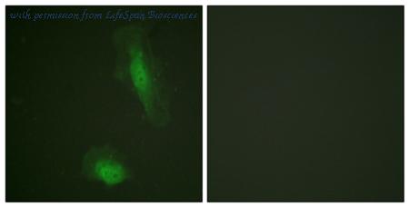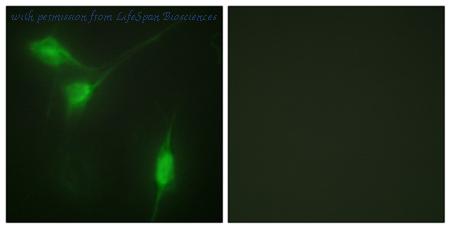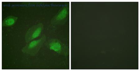 Immunofluorescence analysis of HeLa cells, using Akt Antibody. The picture on the right is blocked with the synthesized peptide.