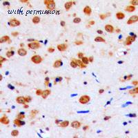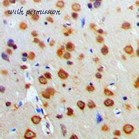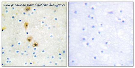 Immunohistochemistry analysis of paraffin-embedded human brain tissue, using Akt Antibody. The picture on the right is blocked with the synthesized peptide.