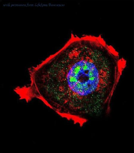 Confocal immunofluorescence of AKT1 Antibody with MDA-MB435 cell followed by Alexa Fluor 488-conjugated goat anti-rabbit lgG (green). Actin filaments have been labeled with Alexa Fluor 555 phalloidin (red). DAPI was used to stain the cell nuclear (blue).