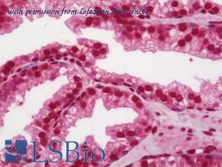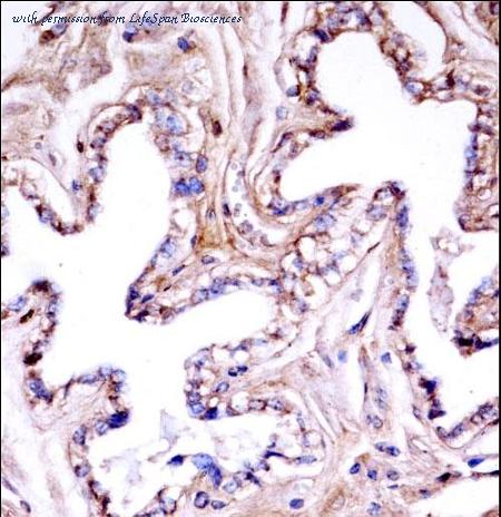 Anti-AKT1 antibody IHC of human prostate. Immunohistochemistry of formalin-fixed, paraffin-embedded tissue after heat-induced antigen retrieval. Antibody concentration 5 ug/ml. This image was taken for the unconjugated form of this product. Other forms have not been tested.
