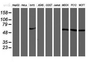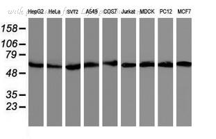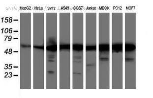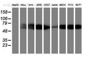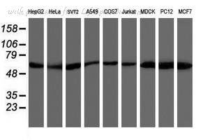 Western blot analysis of AKT expression in MCF7 (A); NIH3T3 (B); PC12 (C) whole cell lysates.