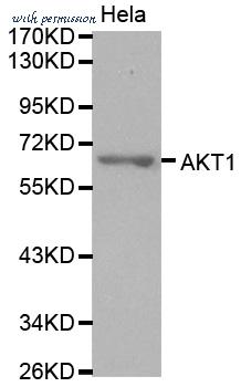 Western blot analysis of lysates from HeLa cells, treated with Insulin 0.01U/ml 15', using Akt Antibody. The lane on the right is blocked with the synthesized peptide.