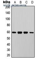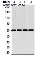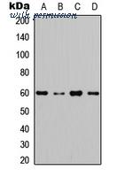 Western blot analysis of AKT expression in MCF7 (A); A549 (B); NIH3T3 (C); rat muscle (D) whole cell lysates.