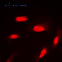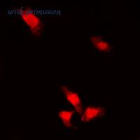 Immunofluorescent analysis of AKT (pS246) staining in HepG2 cells. Formalin-fixed cells were permeabilized with 0.1% Triton X-100 in TBS for 5-10 minutes and blocked with 3% BSA-PBS for 30 minutes at room temperature. Cells were probed with the primary antibody in 3% BSA-PBS and incubated overnight at 4 ??C in a humidified chamber. Cells were washed with PBST and incubated with a DyLight 594-conjugated secondary antibody (red) in PBS at room temperature in the dark. DAPI was used to stain the cell nuclei (blue).