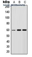 Western blot analysis of AKT (pS246) expression in HepG2 (A); K562 (B); NIH3T3 (C) whole cell lysates.
