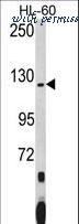Western blot of PUM1 (Human N-term) in HL-60 cell line lysates (35 ug/lane). PUM1 (arrow) was detected using the purified antibody.(2 ug/ml)
