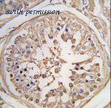 Formalin-fixed and paraffin-embedded human testis tissue reacted with PUM1 Antibody , which was peroxidase-conjugated to the secondary antibody, followed by DAB staining. This data demonstrates the use of this antibody for immunohistochemistry; clinical relevance has not been evaluated.