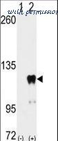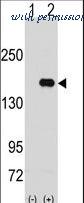Western blot of PUM2 (arrow) using PUM2 Antibody (S182). 293 cell lysates (2 ug/lane) either nontransfected (Lane 1) or transiently transfected with the PUM2 gene (Lane 2) (Origene Technologies).