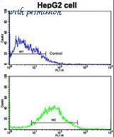 Flow cytometric of HepG2 cells using PUM2 Antibody (S182)(bottom histogram) compared to a negative control cell (top histogram). FITC-conjugated goat-anti-rabbit secondary antibodies were used for the analysis.