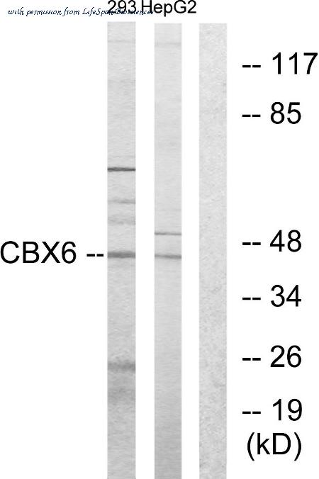 Western blot analysis of lysates from 293 and HepG2 cells, using CBX6 Antibody. The lane on the right is blocked with the synthesized peptide.