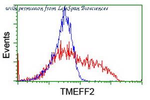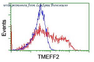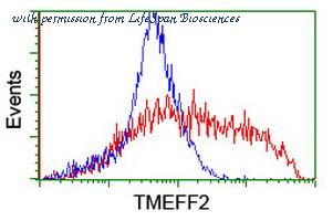HEK293T cells transfected with either overexpress plasmid (Red) or empty vector control plasmid (Blue) were immunostained by anti-TMEFF2 antibody, and then analyzed by flow cytometry.