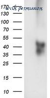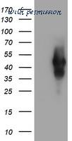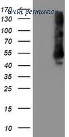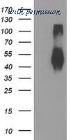 HEK293T cells were transfected with the pCMV6-ENTRY control (Left lane) or pCMV6-ENTRY TMEFF2 (Right lane) cDNA for 48 hrs and lysed. Equivalent amounts of cell lysates (5 ug per lane) were separated by SDS-PAGE and immunoblotted with anti-TMEFF2.