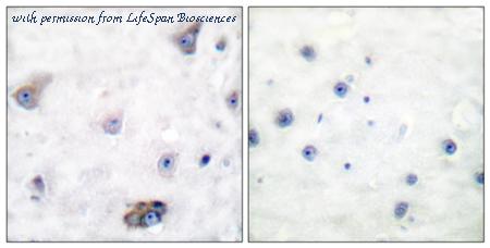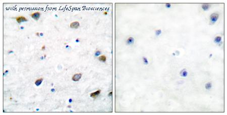Immunohistochemistry analysis of paraffin-embedded human brain, using GABA-RB (Phospho-Ser434) Antibody. The picture on the right is blocked with the phospho peptide.