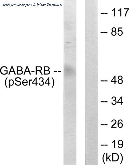 Western blot analysis of lysates from COS7 cells, using GABA-RB (Phospho-Ser434) Antibody. The lane on the right is blocked with the phospho peptide.