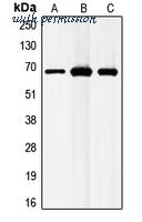 Western blot analysis of GABRB1 (pS434) expression in HeLa (A); mouse brain (B); rat brain (C) whole cell lysates.