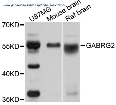 Western blot analysis of extracts of various cell lines, using GABRG2 antibody at 1:1000 dilution. The secondary antibody used was an HRP Goat Anti-Rabbit IgG (H+L) at 1:10000 dilution. Lysates were loaded 25ug per lane and 3% nonfat dry milk in TBST was used for blocking. An ECL Kit was used for detection and the exposure time was 20s.