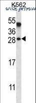 AMELX Antibody western blot of K562 cell line lysates (35 ug/lane). The AMELX antibody detected the AMELX protein (arrow).