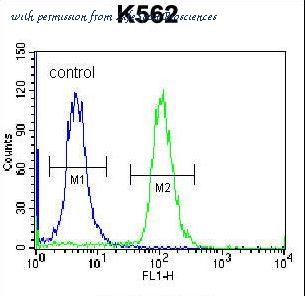 AMELX Antibody flow cytometry of K562 cells (right histogram) compared to a negative control cell (left histogram). FITC-conjugated donkey-anti-rabbit secondary antibodies were used for the analysis.