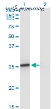 Western Blot analysis of AMELX expression in transfected 293T cell line by AMELX monoclonal antibody (M02A), clone 5B2.Lane 1: AMELX transfected lysate (Predicted MW: 21.6 KDa).Lane 2: Non-transfected lysate.