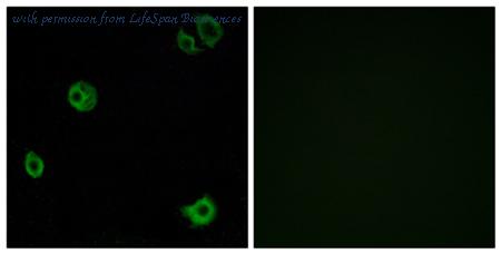 Immunofluorescence analysis of A549 cells, using GPR110 Antibody. The picture on the right is blocked with the synthesized peptide.