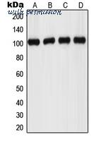 Western blot analysis of GPR110 expression in MCF7 (A); HeLa (B); mouse kidney (C); rat brain (D) whole cell lysates.