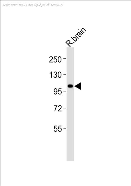 Anti-GPR110 Antibody at 1:1000 dilution + rat brain lysates Lysates/proteins at 20 ug per lane. Secondary Goat Anti-Rabbit IgG, (H+L),Peroxidase conjugated at 1/10000 dilution Predicted band size : 101 kDa Blocking/Dilution buffer: 5% NFDM/TBST.
