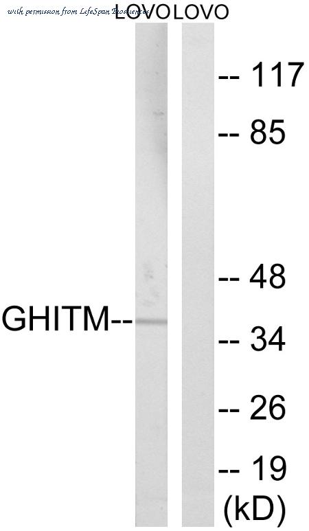 Western blot analysis of lysates from LOVO cells, using GHITM Antibody. The lane on the right is blocked with the synthesized peptide.