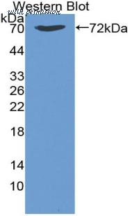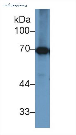 Western Blot; Sample: Bovine Liver lysate; Primary Ab: 1µg/ml Rabbit Anti-Bovine HSPA1B Antibody Second Ab: 0.2µg/mL HRP-Linked Caprine Anti-Rabbit IgG Polyclonal Antibody