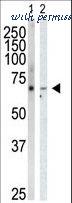 Western blot of anti-GRK6 antibody in HeLa cell lysate (Lane 1) and mouse heart tissue lysate (Lane 2). GRK6 (arrow) was detected using purified antibody. Secondary HRP-anti-rabbit was used for signal visualization with chemiluminescence.