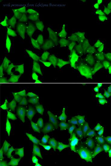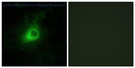 Immunofluorescence analysis of HeLa cells, using GRK6 Antibody. The picture on the right is blocked with the synthesized peptide.
