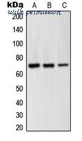 Western blot analysis of GRK6 expression in Jurkat (A); BJAB (B); Ramos (C) whole cell lysates.