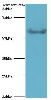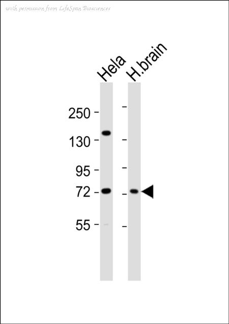 All lanes : Anti-GRK6 Antibody at 1:1000 dilution Lane 1: HeLa whole cell lysates Lane 2: human brain lysates Lysates/proteins at 20 ug per lane. Secondary Goat Anti-Rabbit IgG, (H+L),Peroxidase conjugated at 1/10000 dilution Predicted band size : 66 kDa Blocking/Dilution buffer: 5% NFDM/TBST.