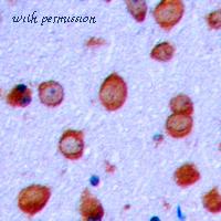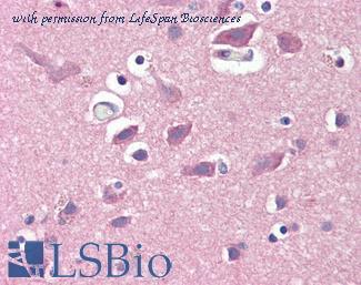 Immunohistochemical analysis of GLUR2 (pS880) staining in human brain formalin fixed paraffin embedded tissue section. The section was pre-treated using heat mediated antigen retrieval with sodium citrate buffer (pH 6.0). The section was then incubated with the antibody at room temperature and detected using an HRP conjugated compact polymer system. DAB was used as the chromogen. The section was then counterstained with hematoxylin and mounted with DPX.