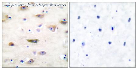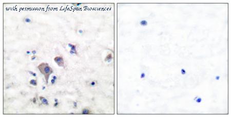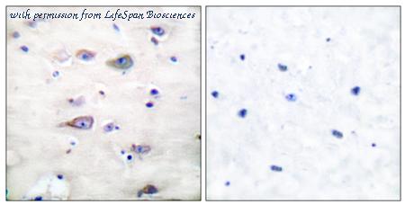 Immunohistochemistry analysis of paraffin-embedded human brain, using GluR2 (Phospho-Ser880) Antibody. The picture on the right is blocked with the phospho peptide.