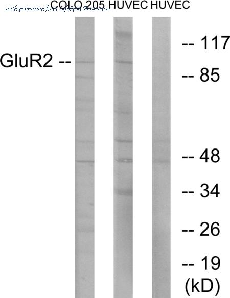 Western blot analysis of lysates from COLO205 and HUVEC cells, using GluR2 Antibody. The lane on the right is blocked with the synthesized peptide.
