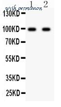 GRIA2 antibody Western blot. All lanes: Anti GRIA2 at 0.5 ug/ml. Lane 1: Rat Brain Tissue Lysate at 50 ug. Lane 2: Mouse Brain Tissue Lysate at 50 ug. Predicted band size: 99 kD. Observed band size: 99 kD.