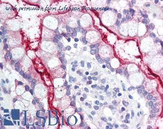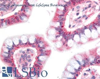 Anti-NPC1L1 antibody IHC of human small intestine. Immunohistochemistry of formalin-fixed, paraffin-embedded tissue after heat-induced antigen retrieval. Antibody concentration 20 ug/ml. This image was taken for the unconjugated form of this product. Other forms have not been tested.