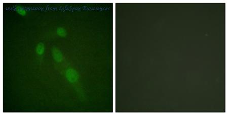 Immunofluorescence analysis of HeLa cells, using Lys-Acetylated Proteins Antibody. The picture on the right is blocked with the synthesized peptide.