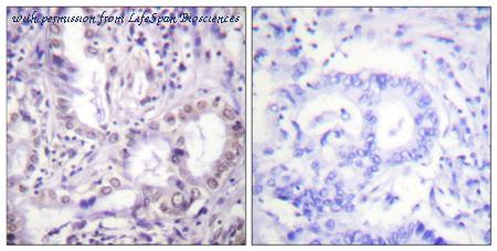 Immunohistochemistry analysis of paraffin-embedded human lung carcinoma, using Lys-Acetylated Proteins Antibody. The picture on the right is blocked with the synthesized peptide.