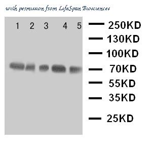 WB of NRG1 / Heregulin / Neuregulin antibody. Lane 1: Rat Spleen Tissue Lysate. Lane 2: Rat Kidney Tissue Lysate. Lane 3: Rat Brain Tissue Lysate. Lane 4: HELA Cell Lysate. Lane 5: SMMC Cell Lysate.