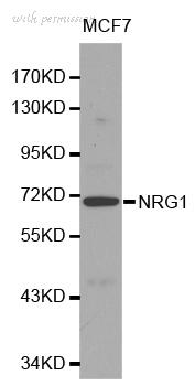 Western blot analysis of extracts of MCF-7 cells, using NRG1 antibody. The secondary antibody used was an HRP Goat Anti-Rabbit IgG (H+L) at 1:10000 dilution. Lysates were loaded 25ug per lane and 3% nonfat dry milk in TBST was used for blocking.