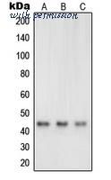 Western blot analysis of Neuregulin SMDF expression in A431 (A); A673 (B); SKNMC (C) whole cell lysates.