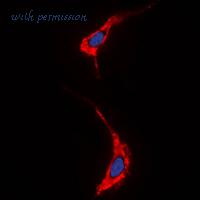 Immunofluorescent analysis of Neuregulin SMDF staining in A431 cells. Formalin-fixed cells were permeabilized with 0.1% Triton X-100 in TBS for 5-10 minutes and blocked with 3% BSA-PBS for 30 minutes at room temperature. Cells were probed with the primary antibody in 3% BSA-PBS and incubated overnight at 4 C in a humidified chamber. Cells were washed with PBST and incubated with a DyLight 594-conjugated secondary antibody (red) in PBS at room temperature in the dark. DAPI was used to stain the cell nuclei (blue).