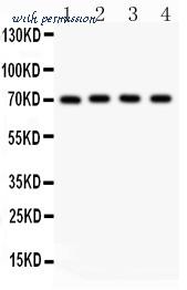 NRG1 antibody Western blot. All lanes: Anti NRG1 at 0.5 ug/ml. Lane 1: MCF-7 Whole Cell Lysate at 40 ug. Lane 2: SKOV Whole Cell Lysate at 40 ug. Lane 3: 22RV1 Whole Cell Lysate at 40 ug. Lane 4: COLO320 Whole Cell Lysate at 40 ug. Predicted band size: 70 kD. Observed band size: 70 kD.
