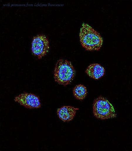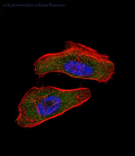 Confocal immunofluorescence of HIF1Alpha Antibody with MDA-MB231 cell followed by Alexa Fluor 488-conjugated goat anti-rabbit lgG (green). Actin filaments have been labeled with Alexa Fluor 555 phalloidin (red). DAPI was used to stain the cell nuclear (blue).