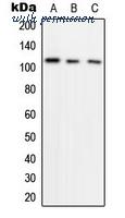 Western blot analysis of HIF1 alpha expression in Raji (A); A431 (B); HeLa (C) whole cell lysates.